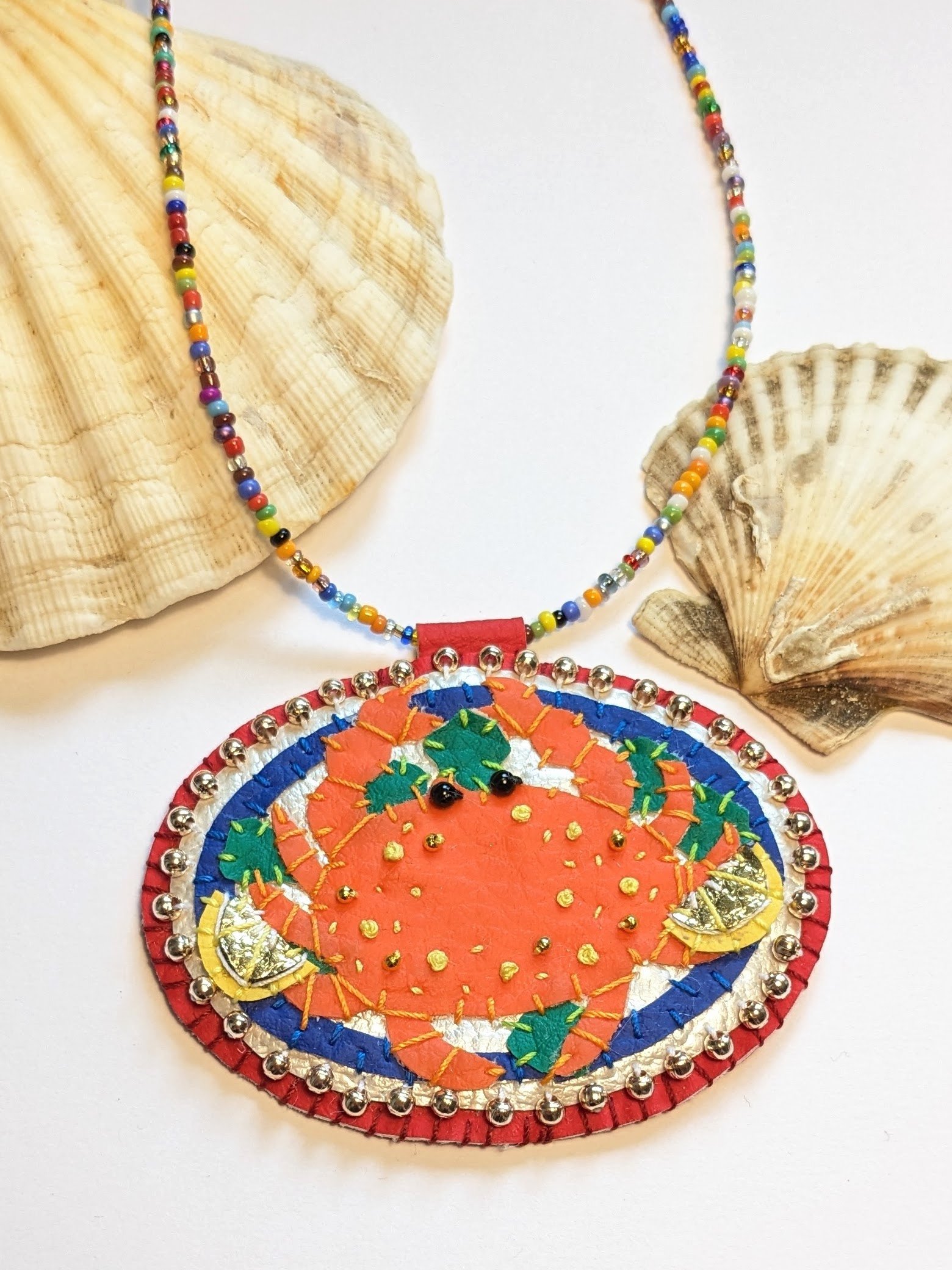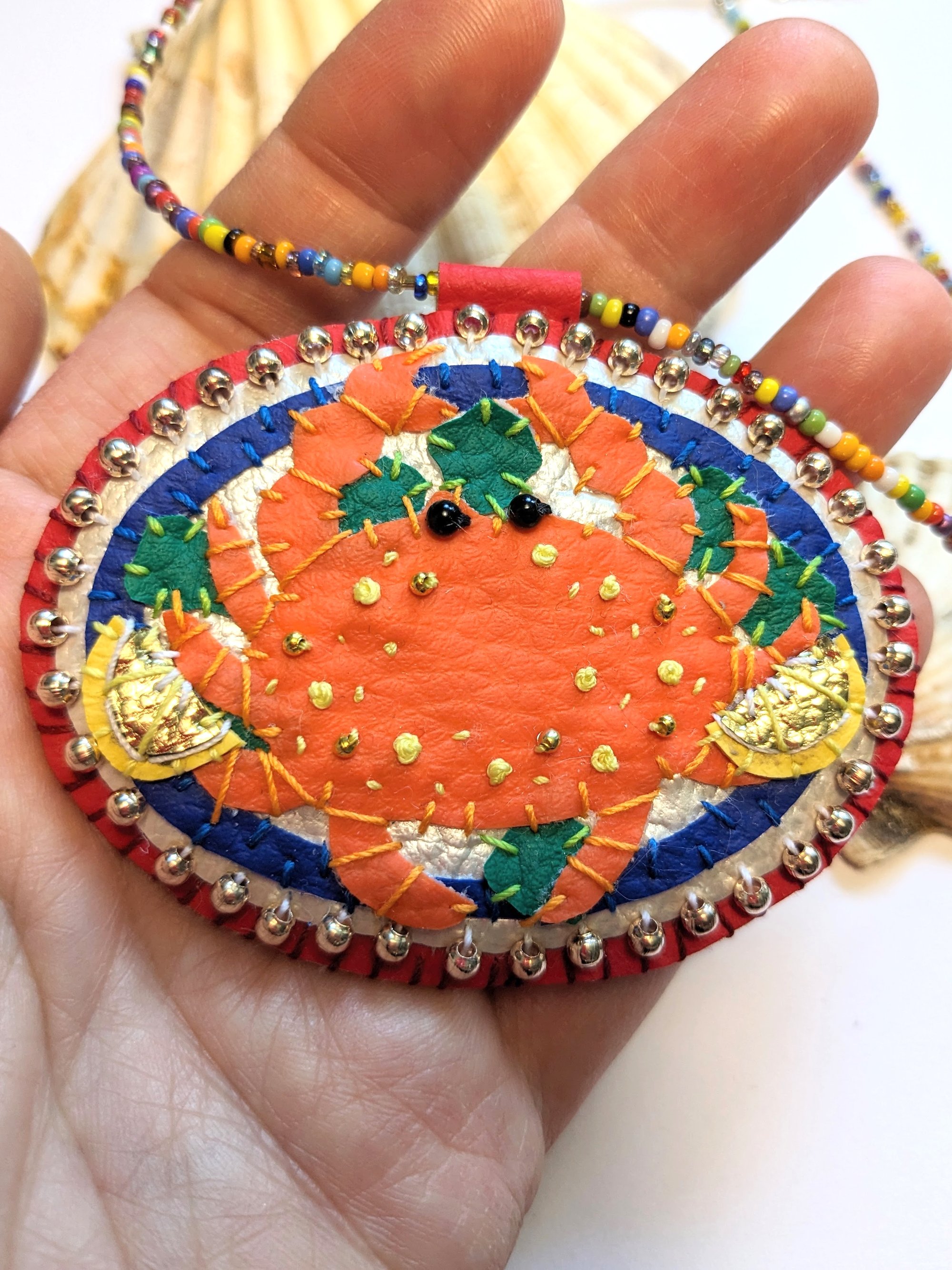 * Gold bead and french knot embellishment on the crab's shell, and a gold beaded edge, on a red background