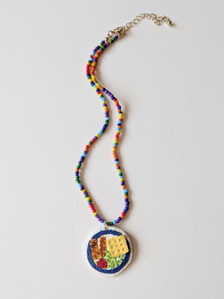* Hand stitched glitter and leatherette plate of fishfingers, hand cut waffles, french knot peas and a dollop of ketchup