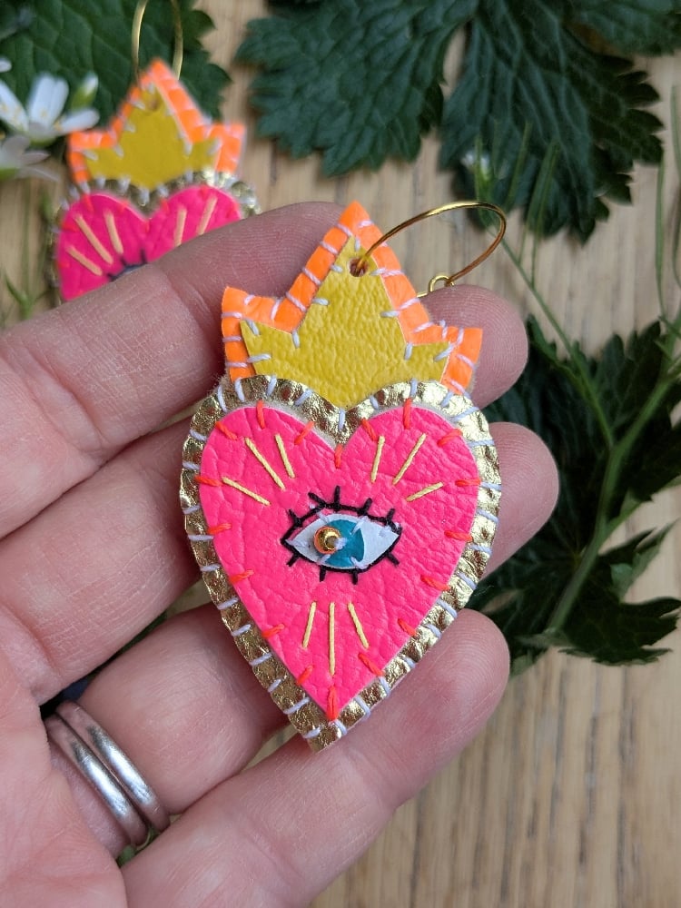 * Show stopper earrings - Neon pink hearts with flames and an all seeing eye