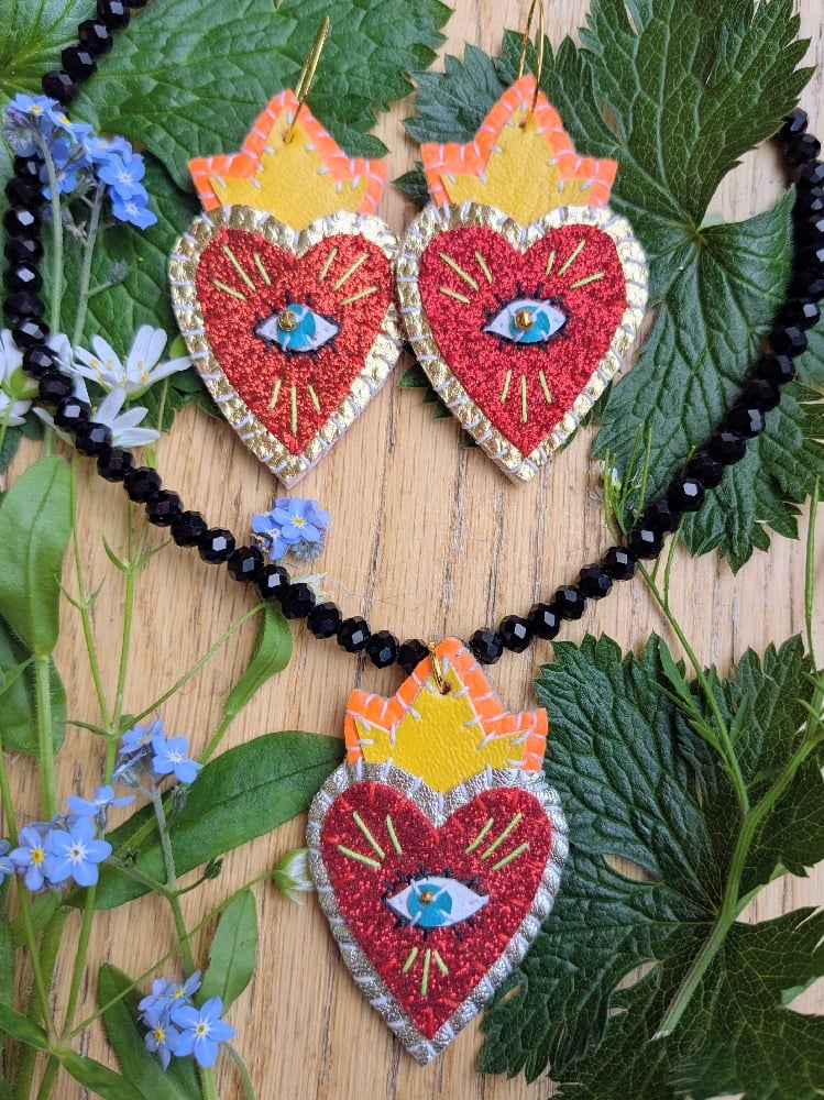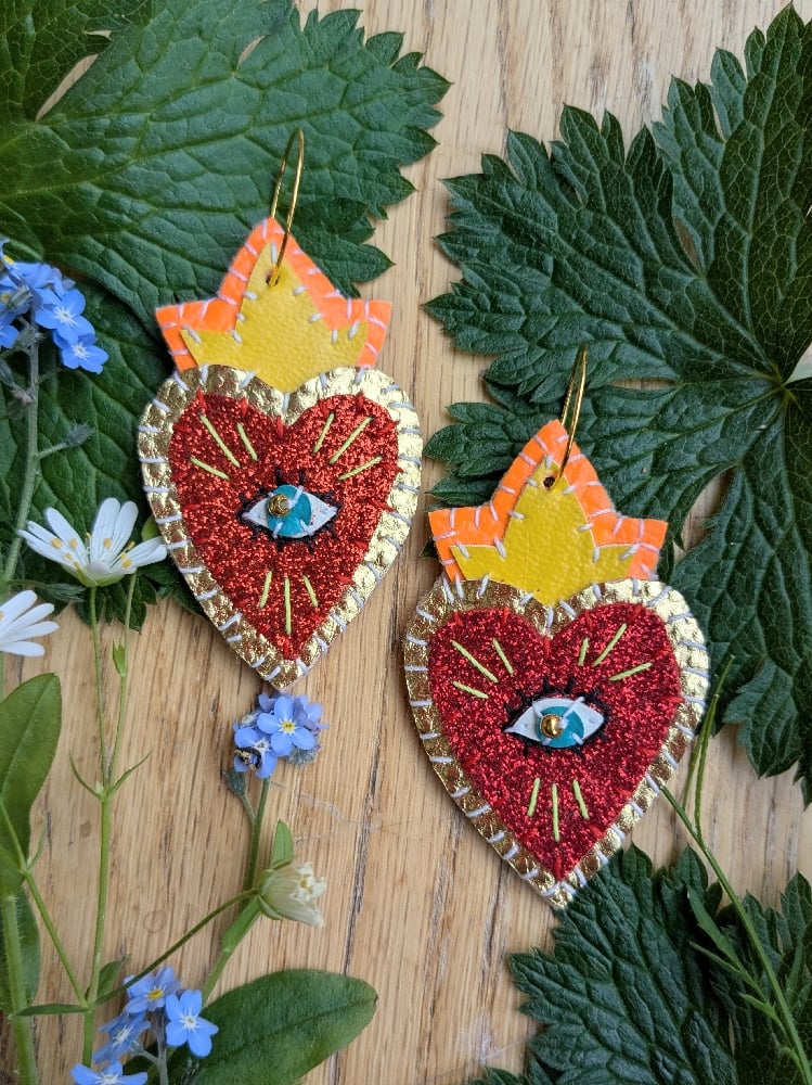 * Show stopper earrings - Glittery hearts with flames and an all seeing eye