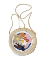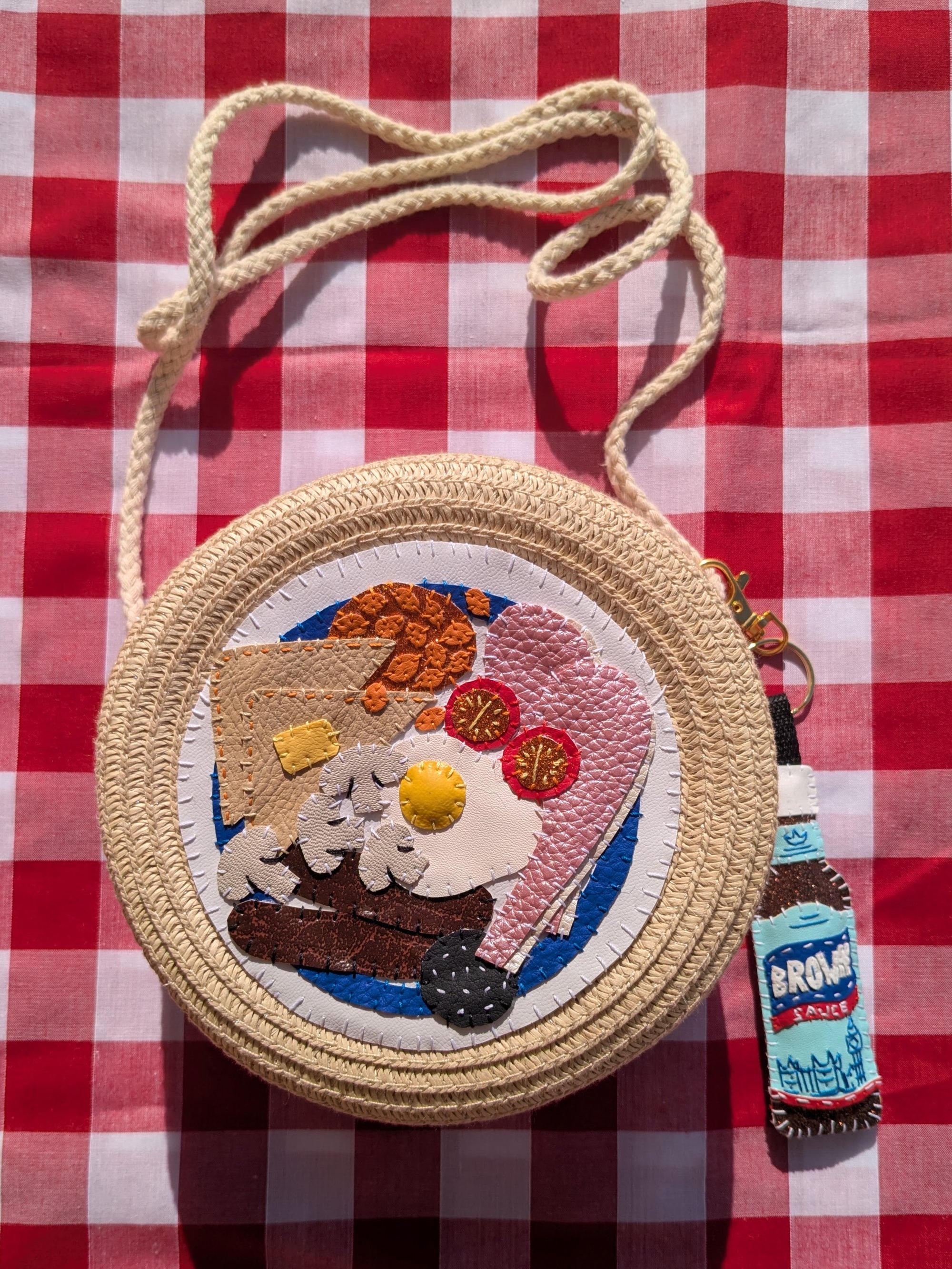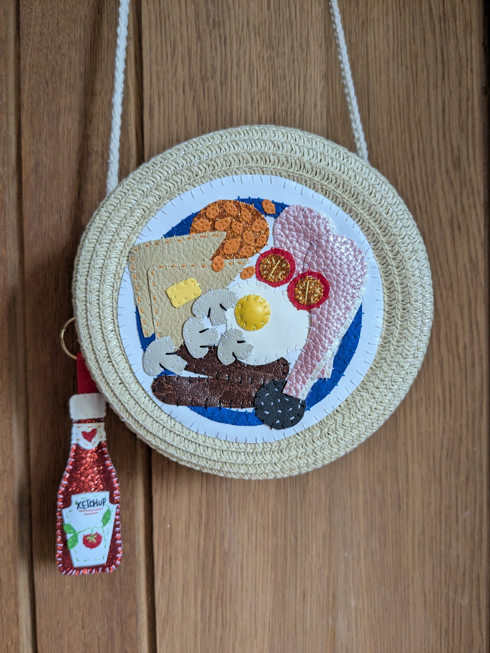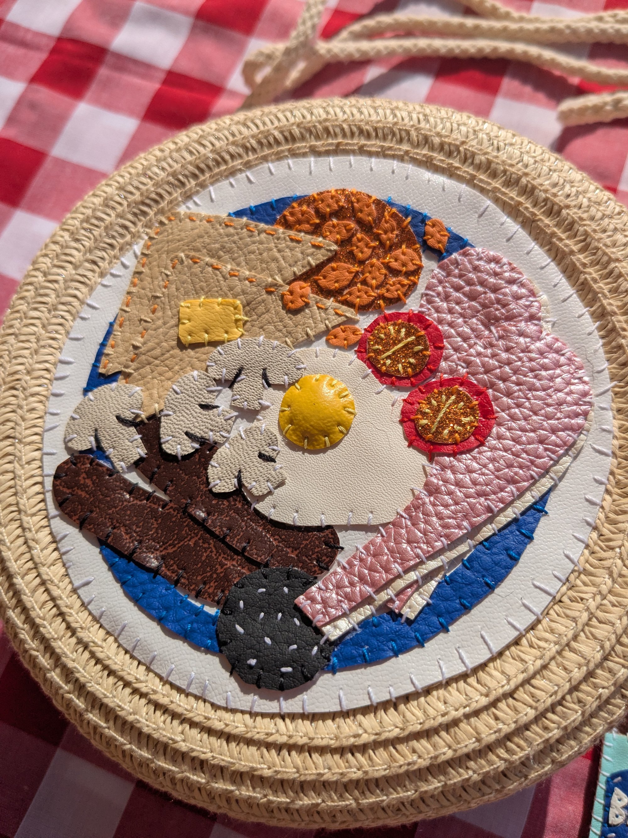 * Vegan friendly leatherette meal, appliqued onto a small raffia bag