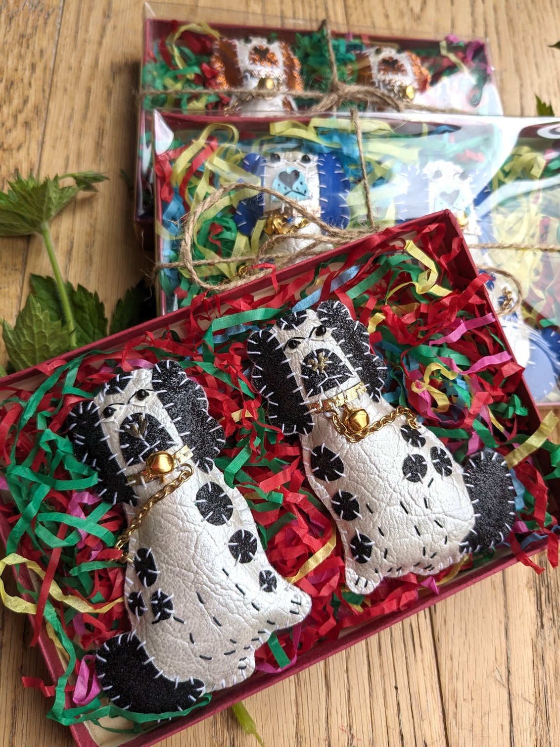 * Black glitter on pearlescent white faux leather, with metallic gold collar and gold bells, with gold chain lead