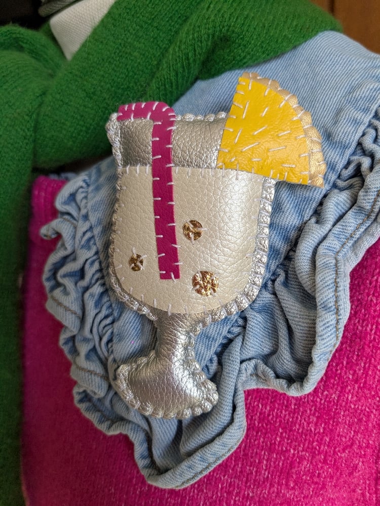 * Hand stitched leatherette cocktail brooch