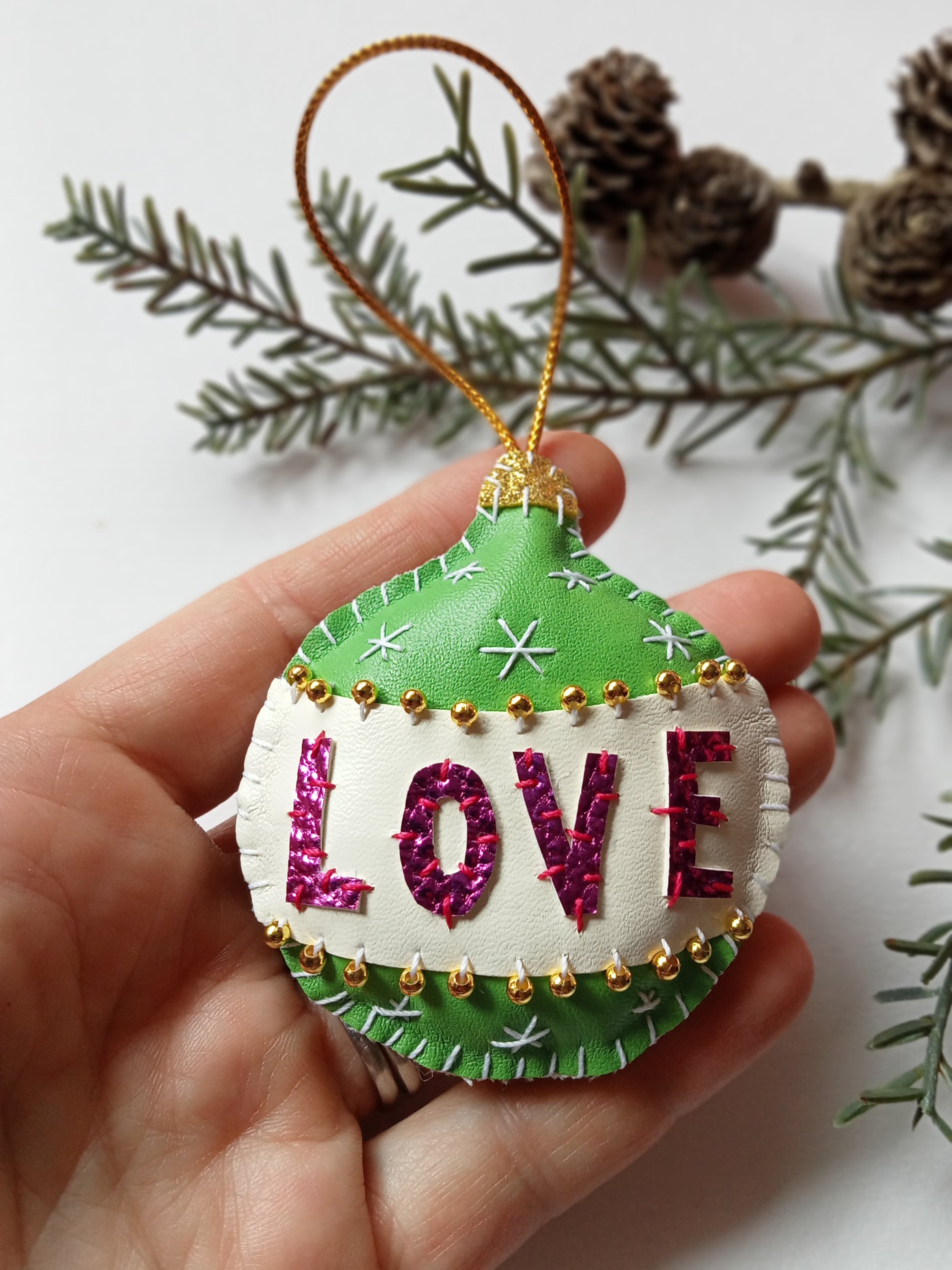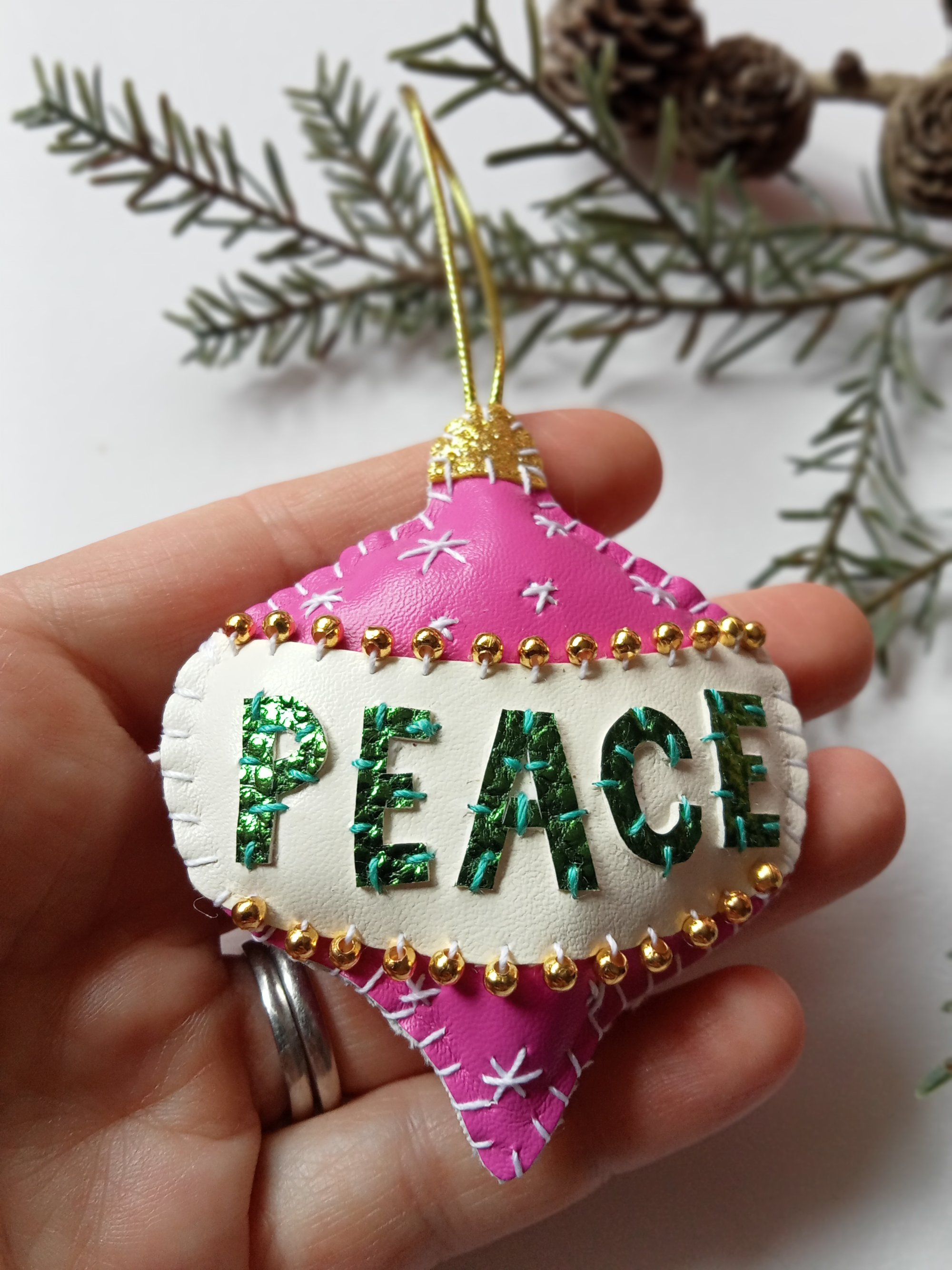 * Hand stitched leatherette with metallic lettering and stitched snow flakes