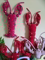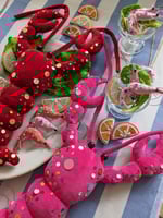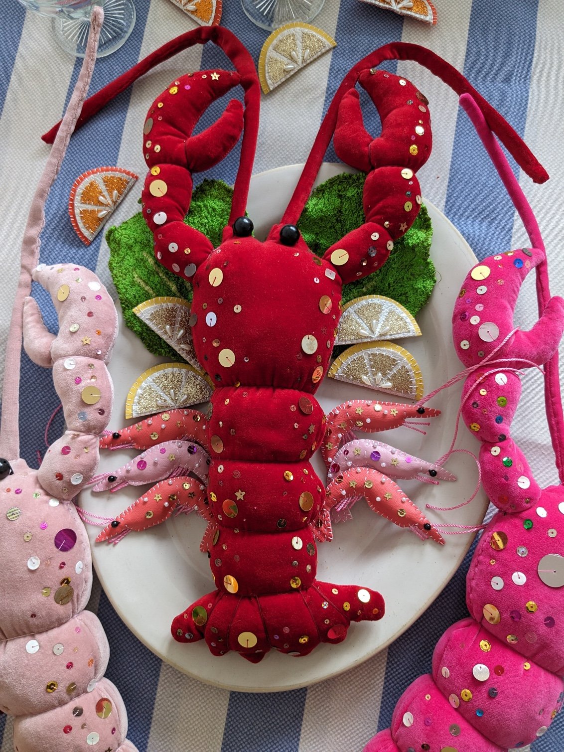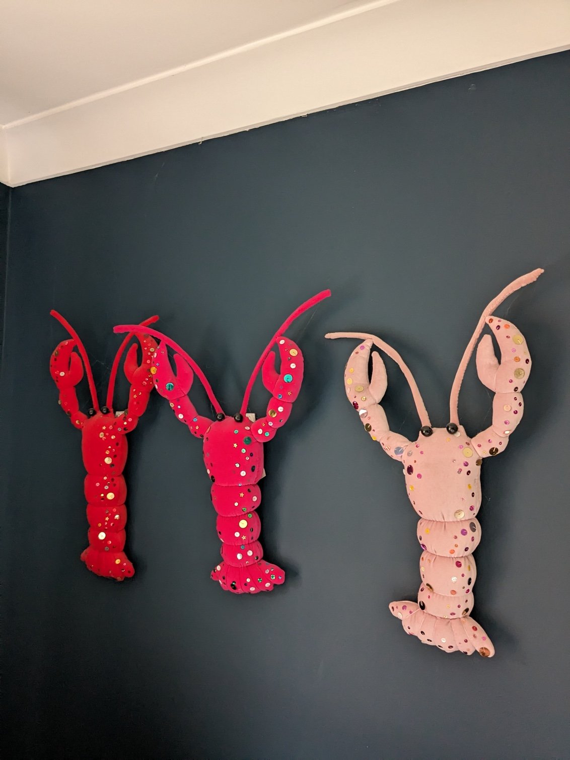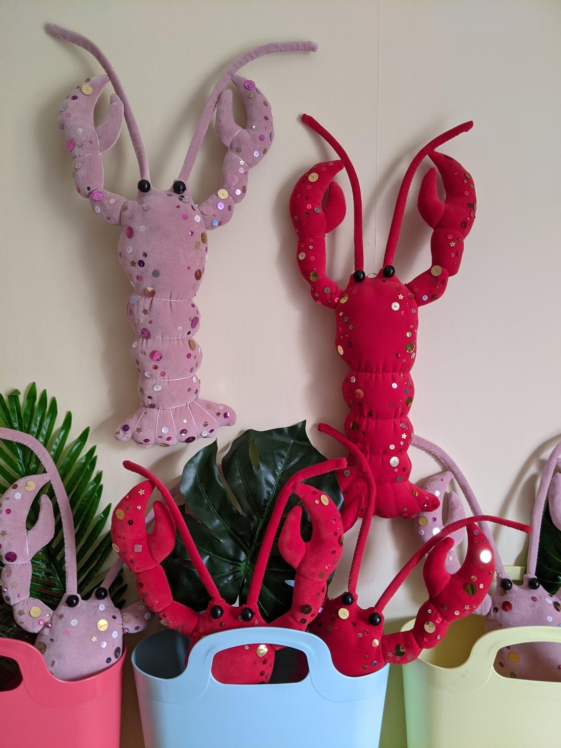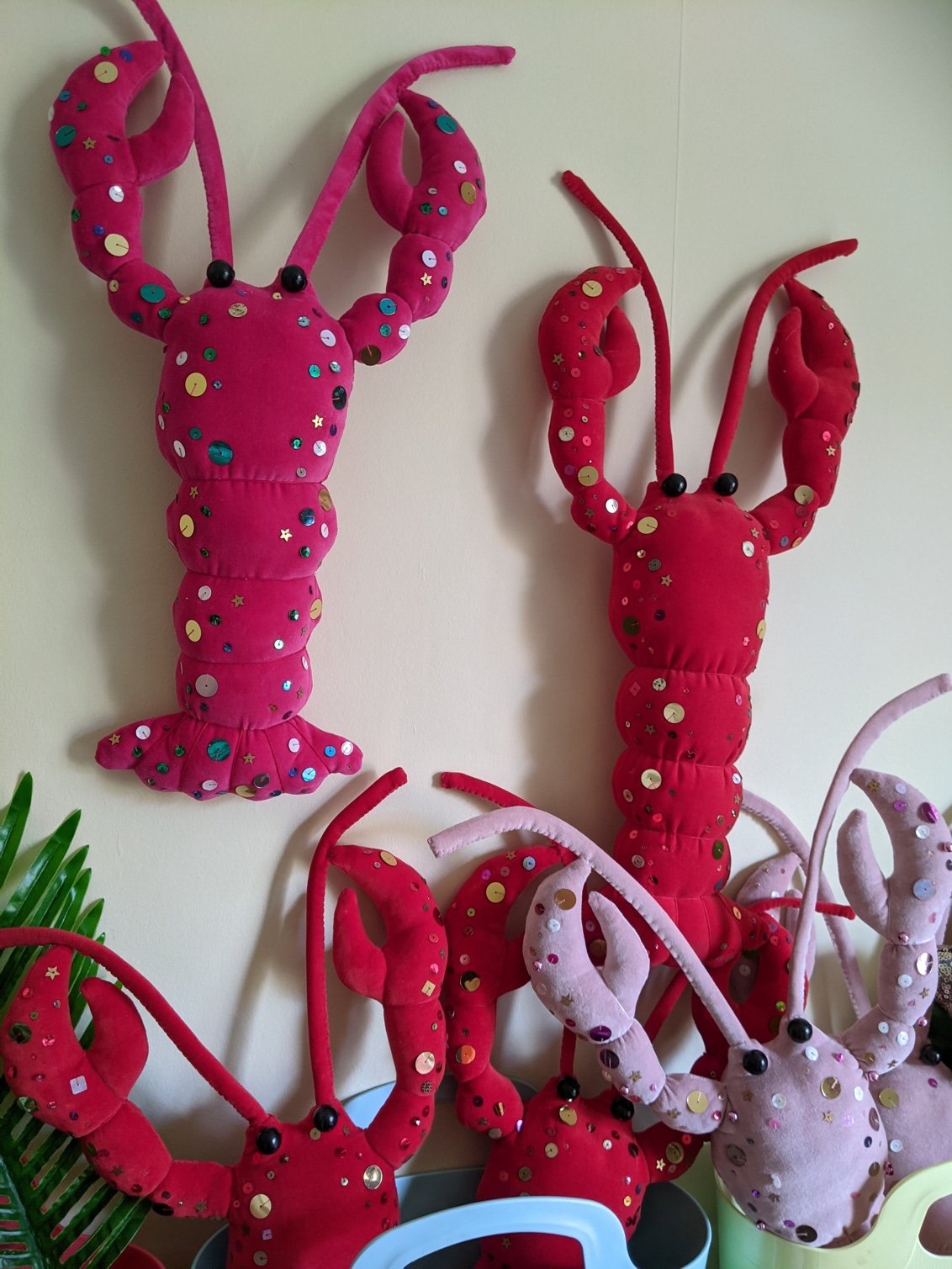 - Beautiful velvet lobsters inspired by a pink spotty papier mache Rock Lobster I made at school 30 years ago (This papier mache creation was subsequently lost on an adventure to Exeter with an ex boyfriend years later, and I never quite got over the lost lobster!)