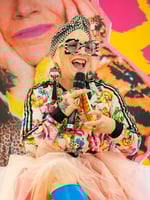 * Hand stitched neon pink, gold and red leatherette and black glitter fabric